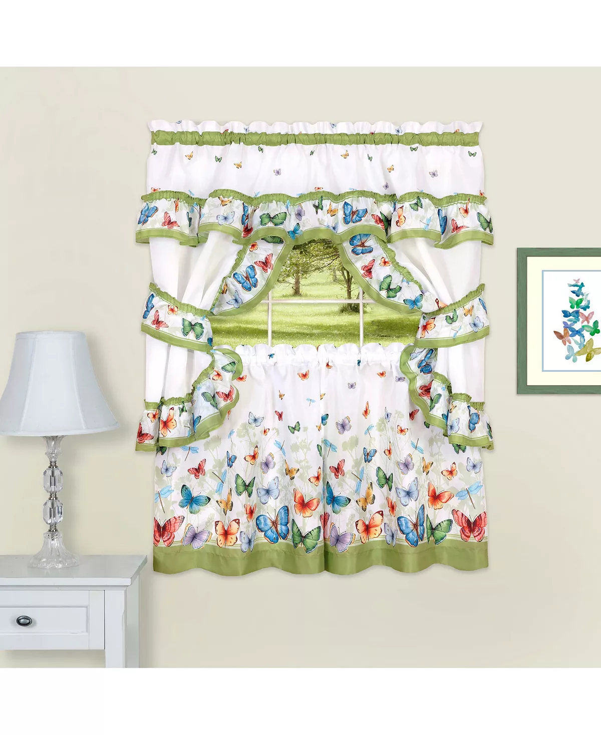 Brighten up any room with the Butterflies Tier, Valance and Swag Set. Each piece is adorned with playful butterflies and dragonflies and accented with green edges. This set is perfect for the kitchen, bathroom, or bedroom.