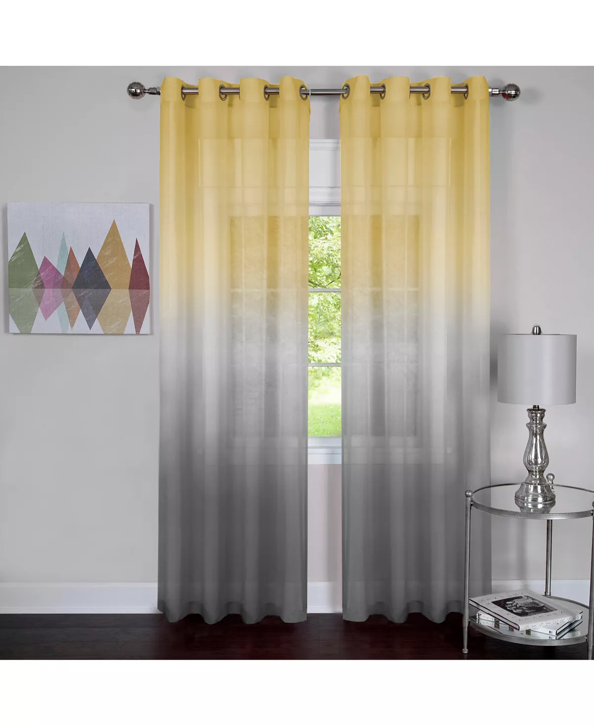 The Rainbow Eight Grommet Window Curtain Panel, is a semi sheer ombre of bold colors. It’s graduated bright colors create the perfect accent to any window in the home. The Rainbow Panel has eight, 1.5 inch antique silver metal grommets that work well with any standard or decorative rod less than one inch in diameter.