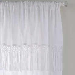 The Calypso Macramé Tassel Semi-Sheer Curtain features a slub texture that has a rich, luxurious hand and soft drape. Hand-knotted macramé faux valance adds globally inspired boho aesthetic that is trendy and versatile. Perfect for creating a light and airy environment, while adding a touch of fashion in any room of the home.