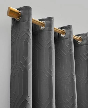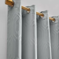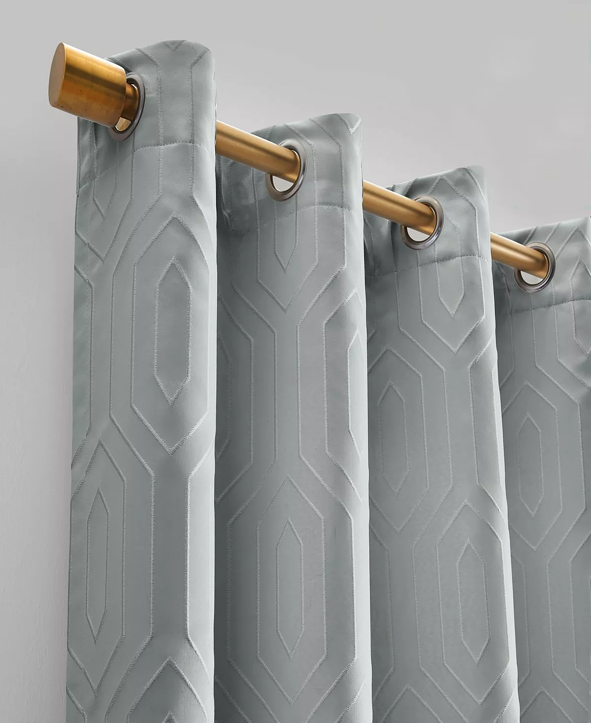 The Huxley curtains feature a tonal geometric pattern. These stylish window panels offer blackout benefits and a rich texture. Blackout liner offers light blocking, thermal and noise reducing benefits.