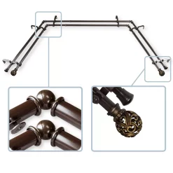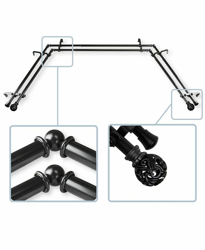 - Includes – Double bay curtain rods, finials, corner connector, and mounting hardware