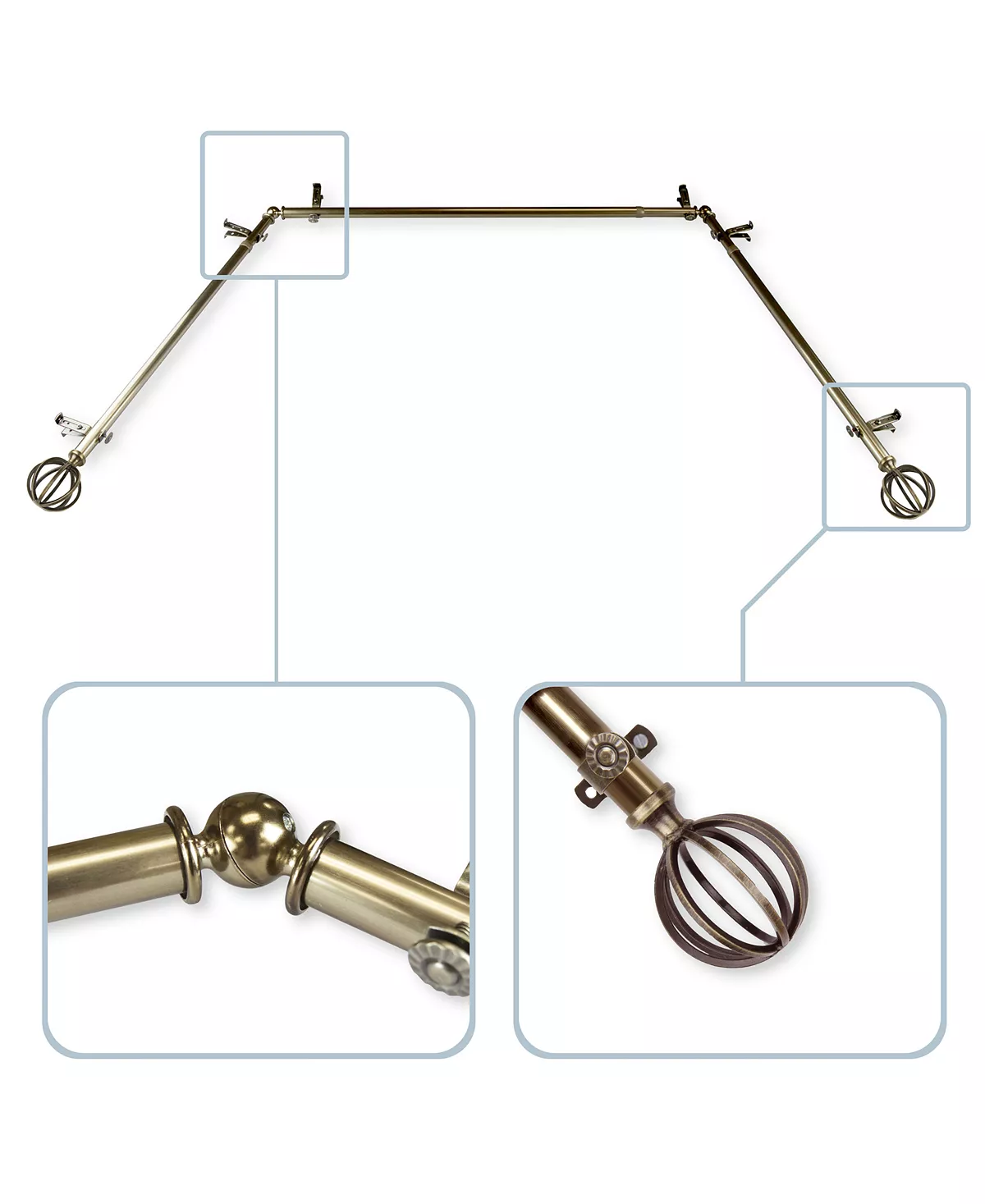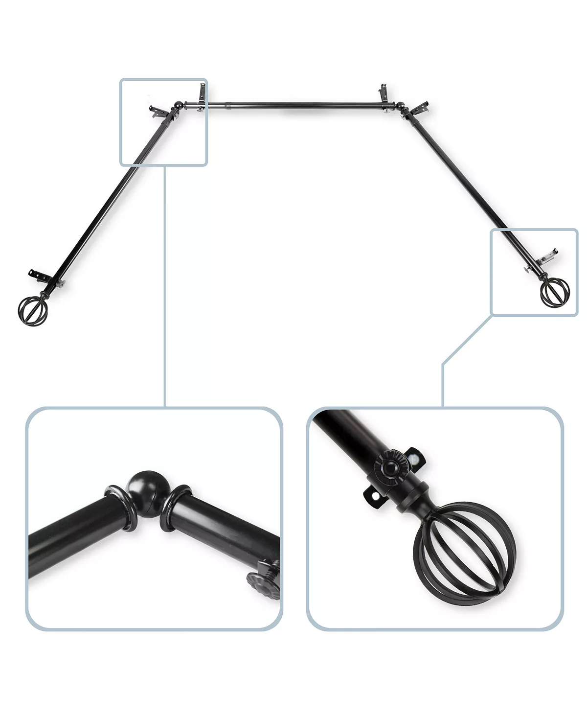 - Includes: three rods, finials, corner connector and mounting hardware